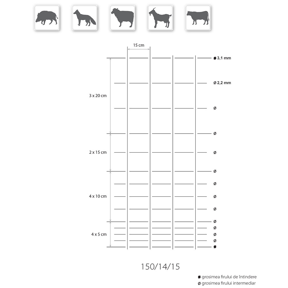 - Distanța dintre sârmele pe verticală: 15 cm